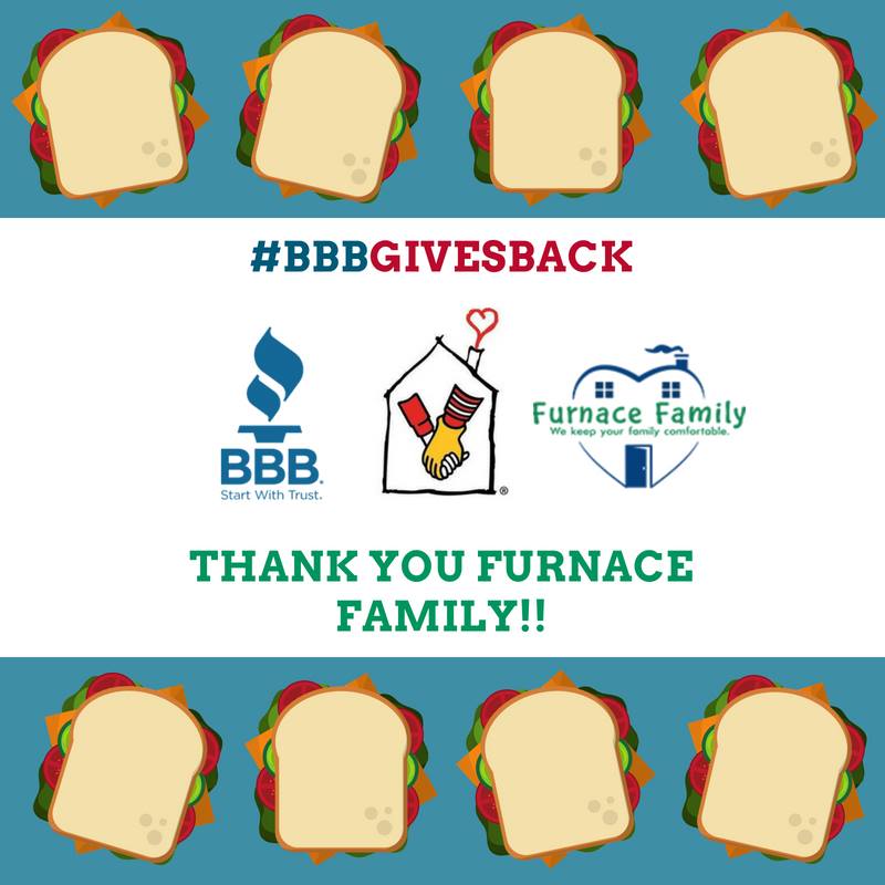 Thank you @furnacefamily for going above and beyond as a #BBBAccreditedBusiness and jumping on board for the #BBBGivesBack campaign benefiting young futurepreneurs of the Ronald McDonald House! With your donation, RMH Families will benefit from the Meals that Mend lunch time programs giving families a break.